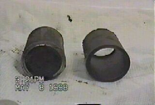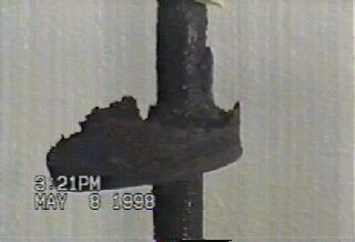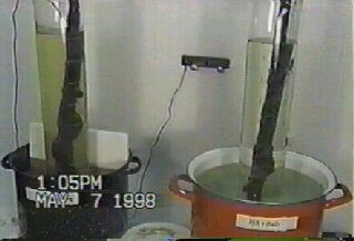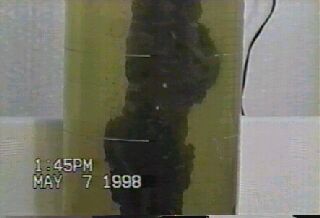 It was postulated that the P\A was simply a mass of paraffins and anthracenes that had become bioaccumulated around and within biofilms. To determine this, some P/A plugged 2" steel distribution pipe was treated with the surfactant CB-4. This surfactant has been used for years in the water well industry as a part of a technology to rehabilitate plugged water wells. CB-4 has a superior ability to attack and destroy the polymeric structures that support the biofilm particularly when the temperatures are elevated 40 or 50oC. The other factor is that the CB-4 becomes biocidal once the concentrations are raised above 0.7%. This technology therefore used a combination of heat and biocidal strength surfactant to attack the P\A black goop. At 57oC it was found that the P\A (left) become unstable and sheared away from the walls leaving the pipe clean again (right).