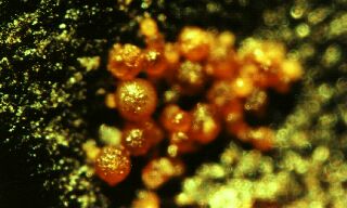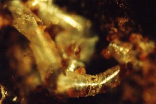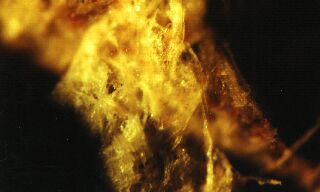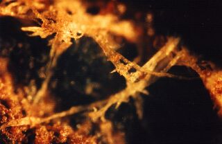 Even more remarkable was the fact that on the underside of the plug, there was a mass of bacterial debris that had floated up the water column more slowly than the P/A and so collected on the underside. Photomicrography revealed structures that have also been seen in rusticles from the RMS Titanic and also from plugging water wells. Three basic structures were observed in the biological debris under the P/A disc. These included: